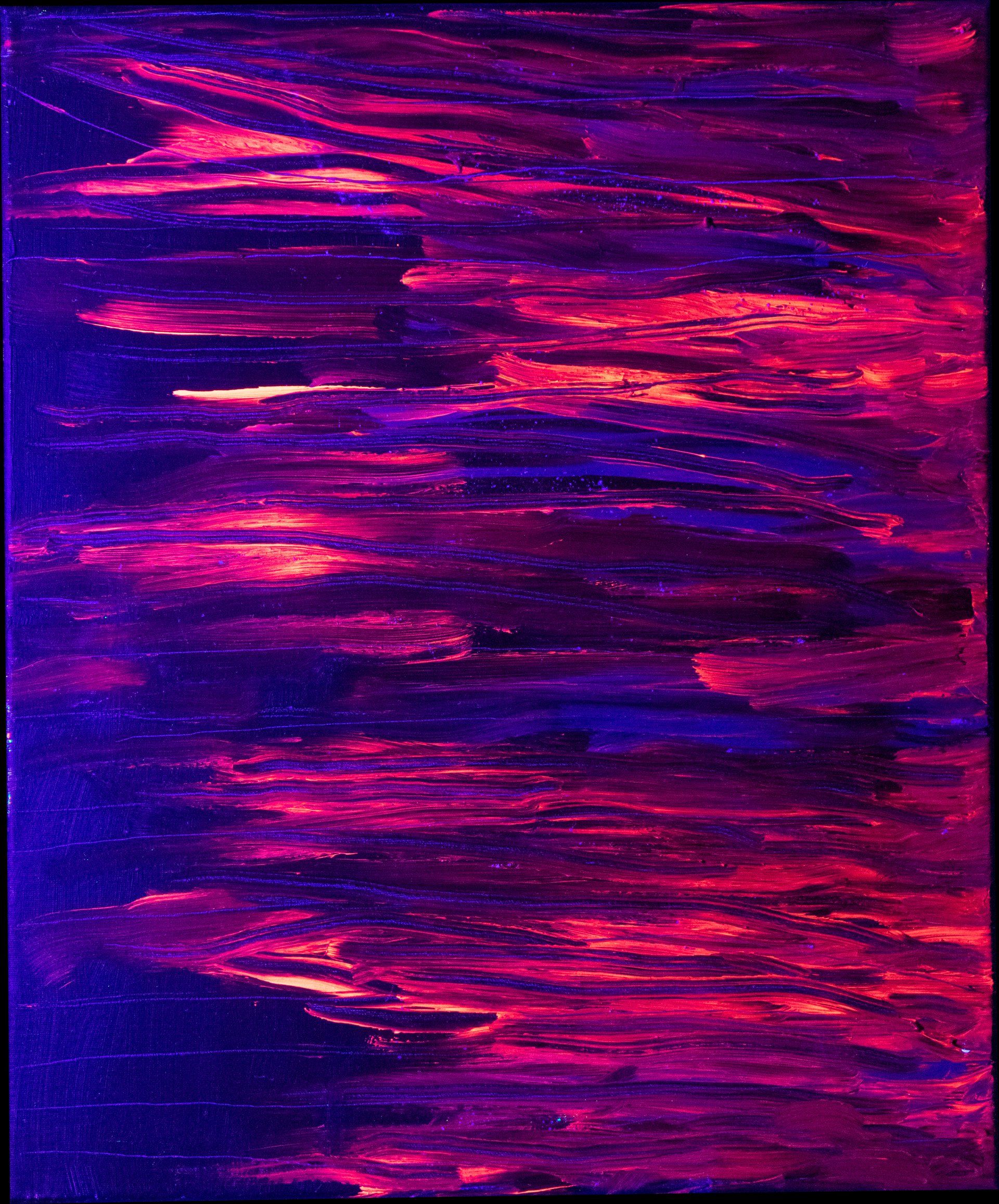 For quite a while now Denis has been experimenting with special paints that have amazing effects when placed under UV-A Light (blacklight). So you have not just one painting but several different paintings depending on the Light used.